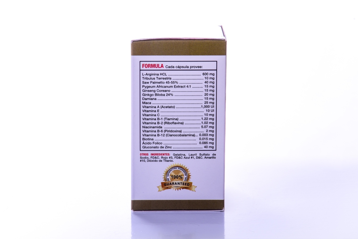 Contiene: l-arginina, tribulis terrestris, saw palmetto, pygeum africano, ginseng, ginkgo biloba, damiana, maca, vitaminas A, E, C, B1, B2, B6, B12, nacina, biotina, ácido fólico y zinc.