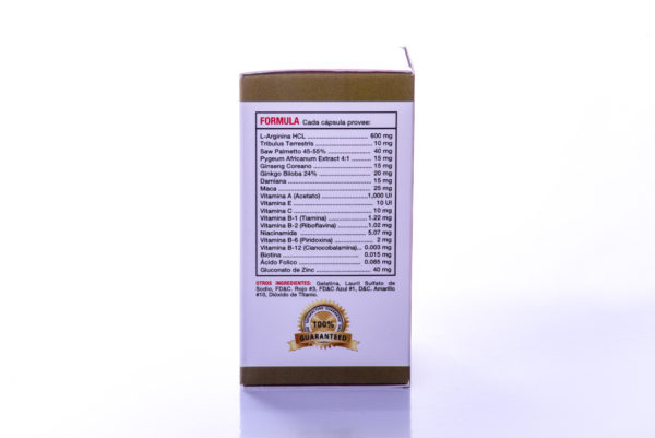 Contiene: l-arginina, tribulis terrestris, saw palmetto, pygeum africano, ginseng, ginkgo biloba, damiana, maca, vitaminas A, E, C, B1, B2, B6, B12, nacina, biotina, ácido fólico y zinc.