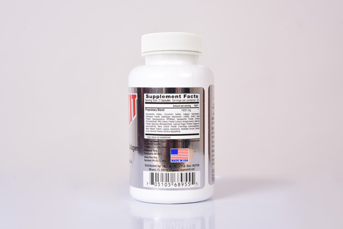Contiene:  Glucosamina, condroitina, colágeno, hidrangea, harpagófito, zarzaparilla, lechuga silvestre, valeriana, pimienta cayena, black cohosh, nogal negro, bardana y boswellia.